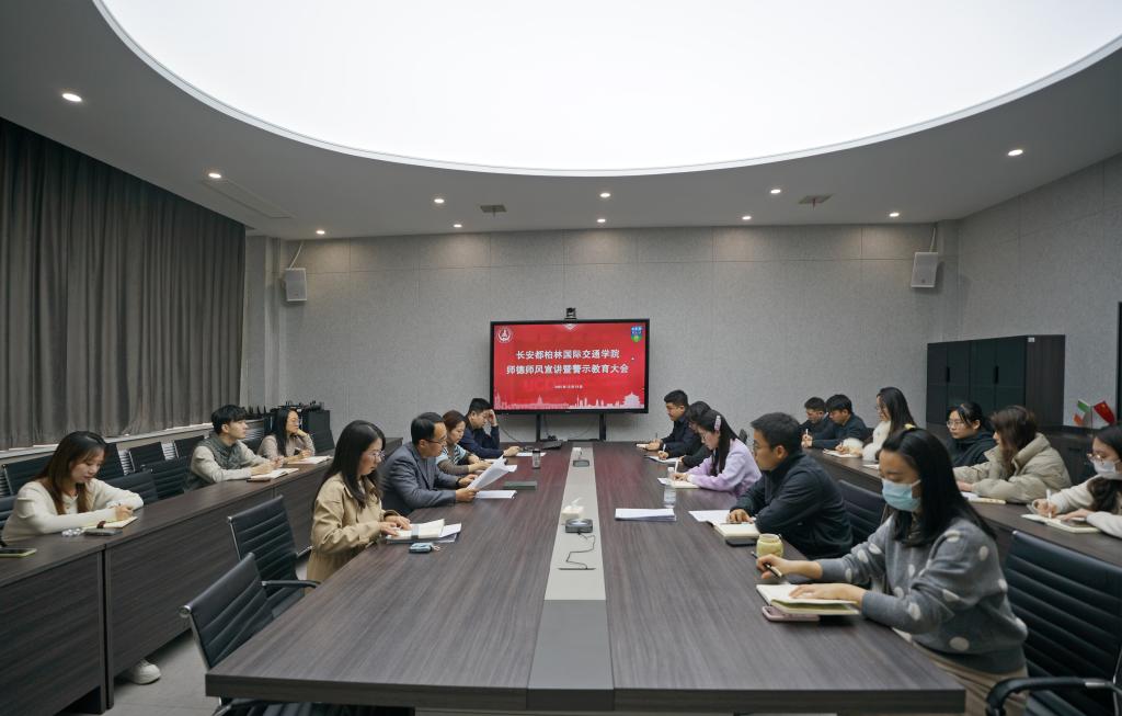 于鸿远教学楼四楼会议室召开了师德师风宣讲暨警示教育大会。学院领导班子及全体教职工参加会议。会议由副院长贺燕飞主持。